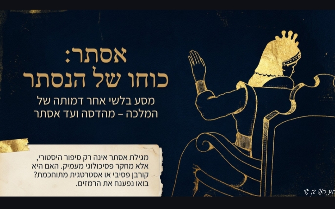 מגילת אסתר כוחו של הנסתר 11.2.2026 אחר • היסטוריה • שפה • תנ"ך • תרבות יהודית ישראלית ז • ח • ט 4 0 0 פותחים שערמוטיב בהסתרה במגילת אסתר מעבר לקישור