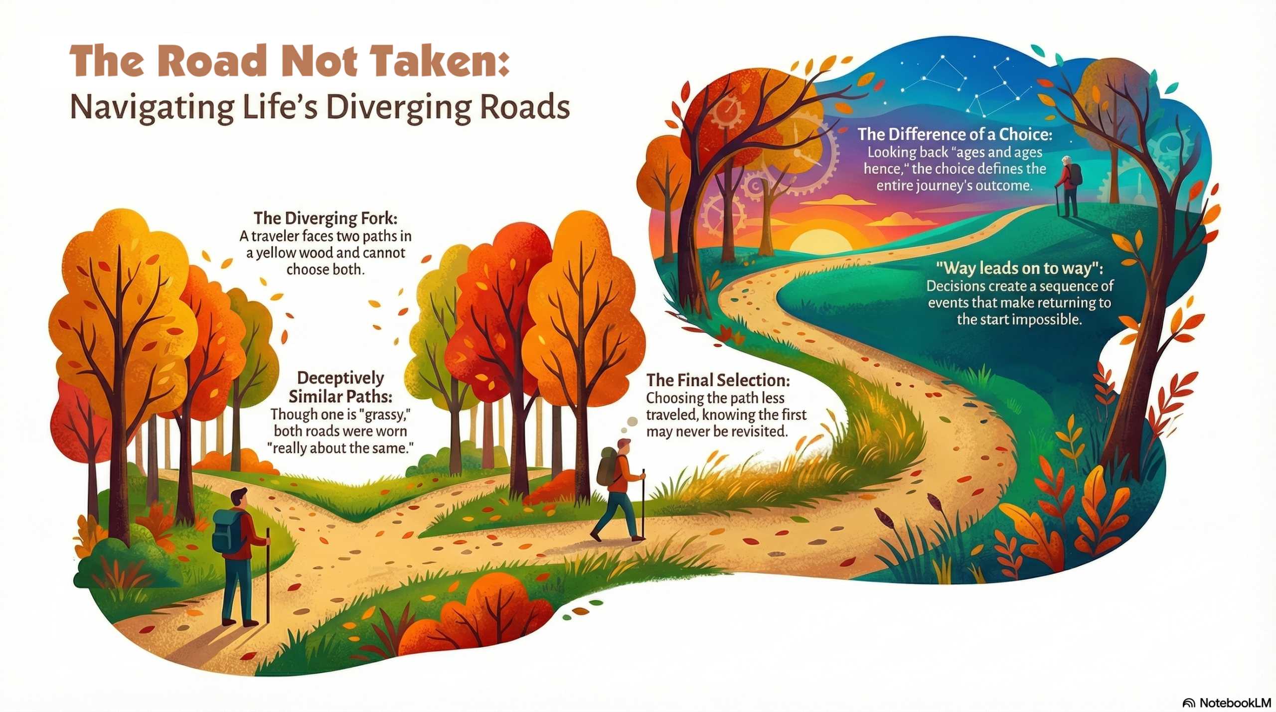 אינפוגרפיקה הממחישה בצורה ויזואלית ומעניינת את השיר, ולמעשה מנתחת אותו בקצרה תוך התייחסות לכל האלמנטים העיקריים בשיר. האינפוגרפיקה נוצרה לאחר שבמספר כיתות שלימדתי את השיר הרגשתי שהתלמידות לא מספיק מבינות את העומק שלו ואת המשל היפה שהוא מהווה לצמתי בחירה בחיים.