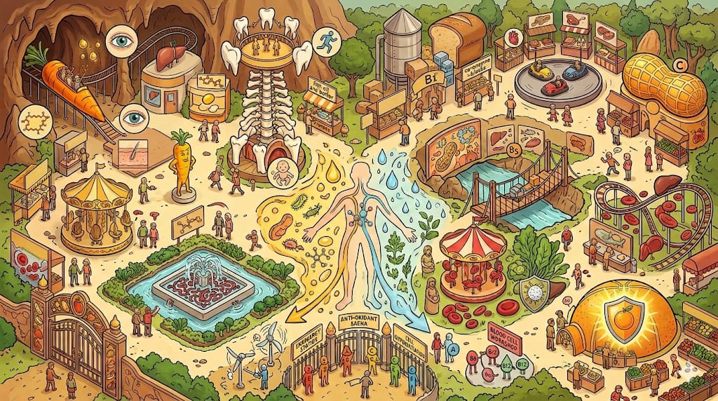 הנה ה"מפתחות" לפתרון תחנות המטמון המסתתרות באיור "לונה פארק הוויטמינים". האיור מחולק לשני אזורים עיקריים לפי סוג המסיסות (שומן מול מים), וכל תחנה מייצגת את המקורות או התפקידים של הוויטמינים השונים: