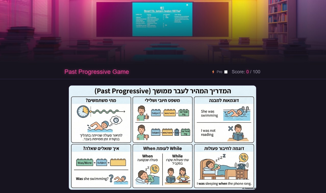 משחק אנטרקטיבי באנגלית בנושא Past Progressive עם משוב מיידי ( ציון מספרי)