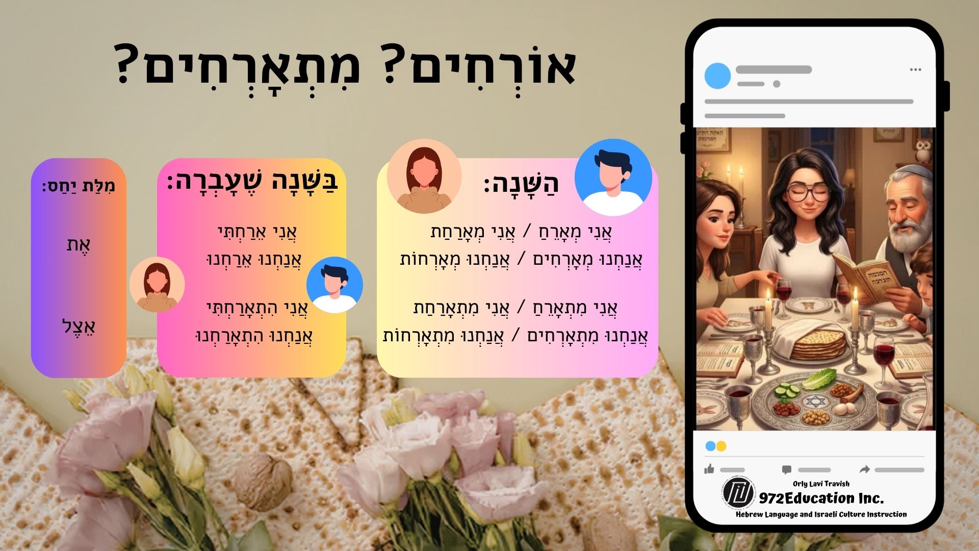 אורחים או מתארחים? 26.3.2026 שפה • תרבות יהודית ישראלית ו • ז • ח • ט • י • יא • יב 3 0 0 עבריתעברית כשפה שניהפסחתבניות לשוניותלומדי עברית כשפה שניה יתרגלו תבניות לשוניות הקשורות לפעלים מארח/ מתארח מעבר לקישור