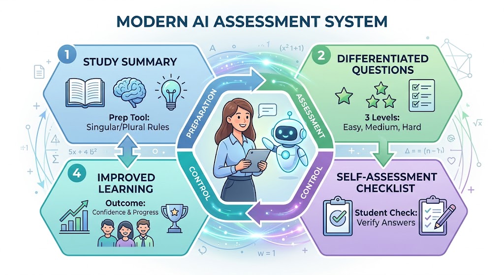 מערכת הערכה באנגלית (יחיד/רבים) לכיתה ה', הכוללת 3 כלים המשלימים זה את זה: דף סיכום, בנק שאלות וצ'קליסט.