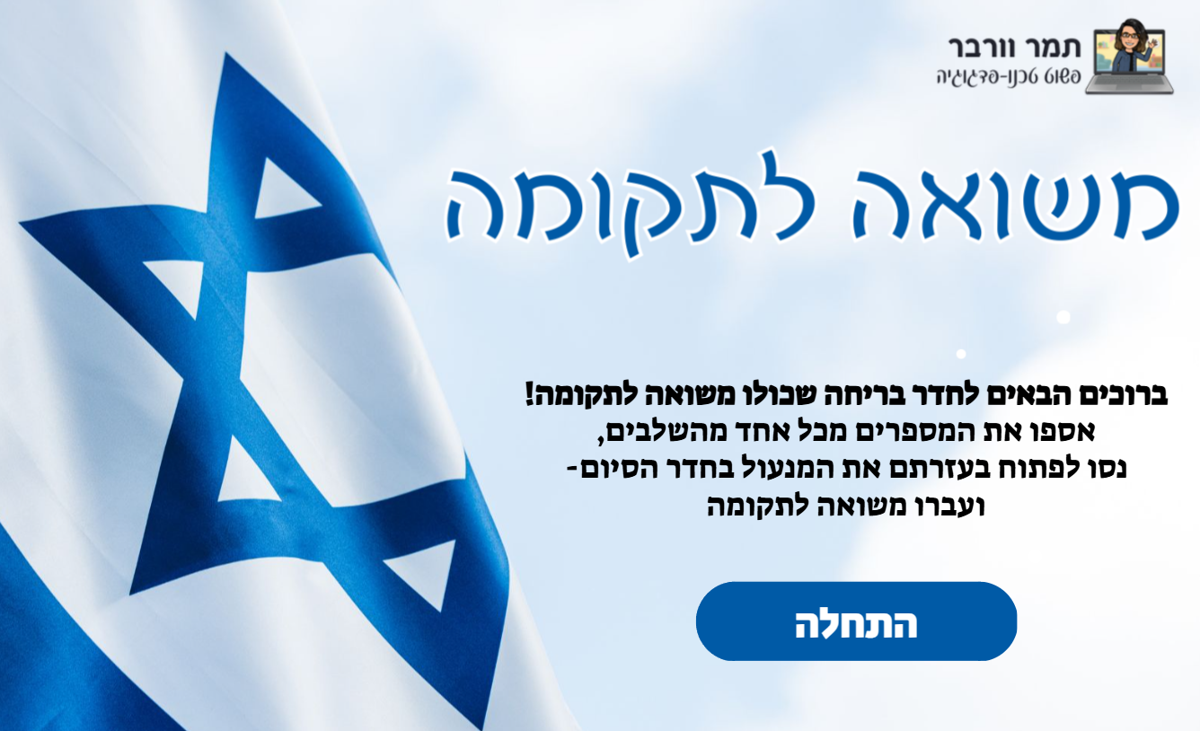 חדר בריחה משואה לתקומה 13.4.2026 מעגל השנה ז • ח • ט • י • יא • יב 2 0 0 חדר בריחהמשתפת אתכם בחדר בריחה שמתאים לתקופה הזו של השנה – משואה לתקומה תשובות ישלחו בהמשך. בתקווה שנגיע כבר לימים שקטים יותר 🙏🇮🇱 מעבר לקישור