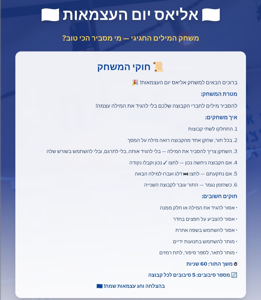 אליאס יום העצמאות 21.4.2026 כללי • תרבות יהודית ישראלית ז • ח • ט • י • יא 1 0 0 פותחים שערמשחק אליאס ליום העצמאות ה78 מעבר לקישור