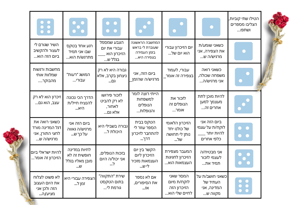 מעין משחק על הלוח שבו זורקים את הקוביות וכל פעם יש שאלה אחרת שעולה. הפעילות נוצרה על ידי פסגה לוד. העיצוב והתוכן שלהם. אני רק הפכתי לפעילות דיגיטלית.