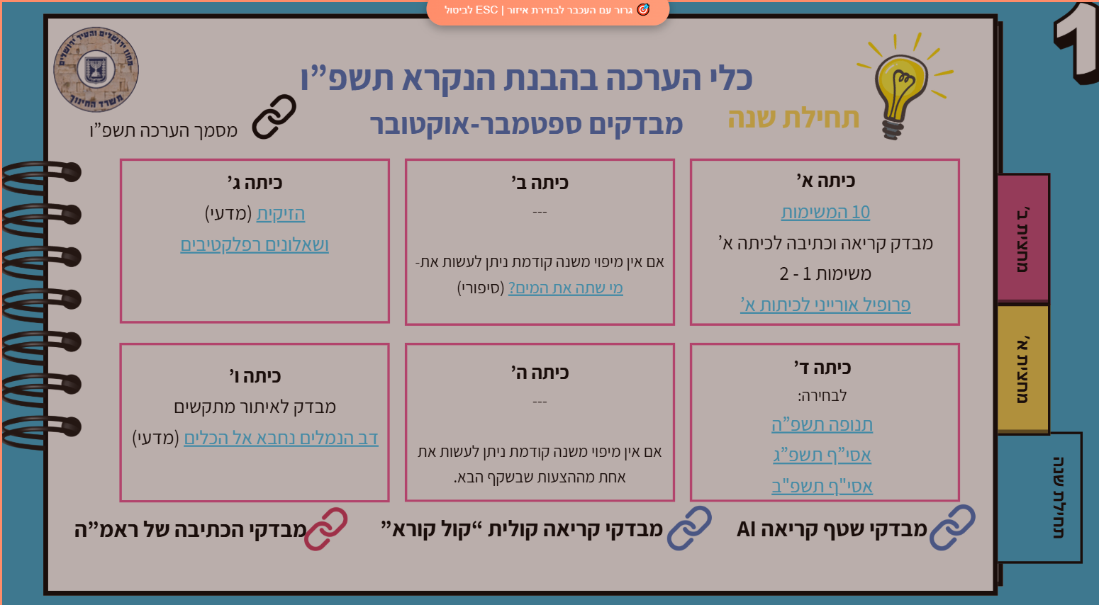 מבדקים ומיפויים בשפה 16.10.2025 מדע וטכנולוגיה • שפה א • ב • ג • ד • ה • ו 3 0 0 אוסףאסיףמבדקמשימותפרופיל אורייניקריאה קוליתשטף קריאהתנופהמעודכן לתשפ"ו – עפ"י מסמך הערכה תשפ"ו, אוסף מבדקים ייעודיים לשכבות היסודי