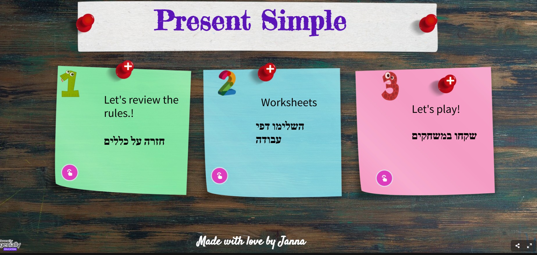 Present Simple learning unit 10.11.2025 אנגלית ו • ז • ח • ט • י 87 0 2 אנגליתיחידת לימוד בנושא זמן הווה פשוט באנגלית הכוללת שיעור מוקלט, דפי עבודה דיגיטליים ומשחקים מעבר לקישור