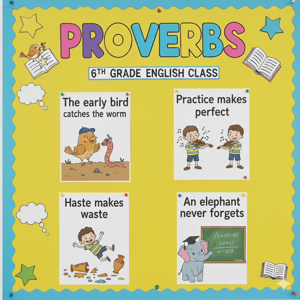 A visual-centered practice sheet designed to help Grade 6 students learn common English proverbs through clear, supportive images. The worksheet relies heavily on pictures to enhance comprehension, make abstract ideas easier to understand, and support learners who benefit from strong visual cues.