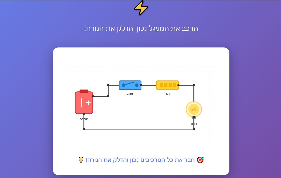 אני מורה לאלקטרוניקה וחשמל לכיתות ט. צור לי משחק שבו התלמידים מרכיבים מעגל חשמלי מרכיבים שונים ובודקים אם הם חיברו את כל המרכיבים שלמדנו בשיעור.