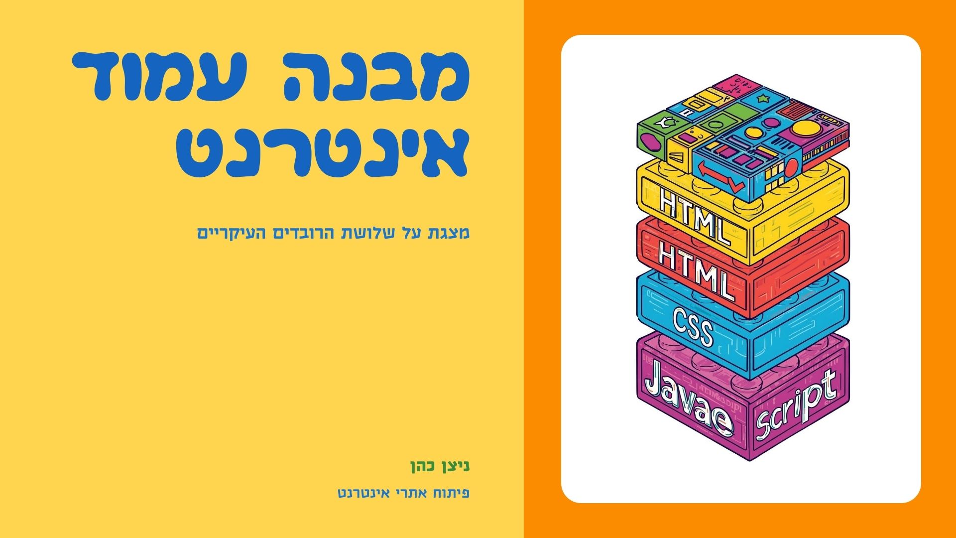 מצגת לכיתות ה'-ו', או לתחילת חטיבת ביניים, עם נושאי שיעור בסיס על מבנה עמוד אינטרנט, ועל חשיבותן של שלוש הרגליים העיקריות שמחזיקות כל עמוד באינטרנט - HTML, CSS ו-JS.