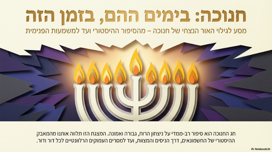 מצגת וסרטון על חג החנוכה 2.12.2025 מעגל השנה ז • ח • ט • י • יא • יב 41 1 0 חגיםחנוכהמצגת על ההיסטוריה, ההלכות והמנהגים של חג החנוכה, מתאים מחטיבה ומעלה מעבר לקישור