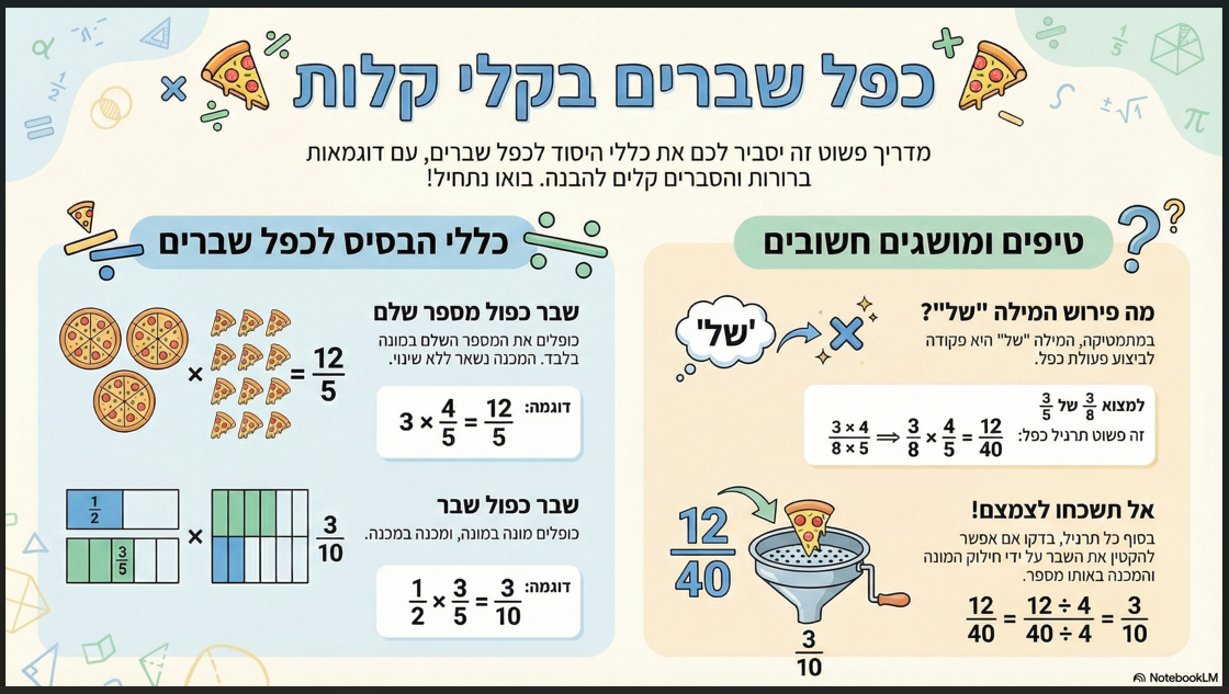 כפל שברים – תרשים הסבר 4.12.2025 מתמטיקה ו 44 2 0 כפל שבריםמורים לחשבוןעולים שלבשברים שעובדים ביחדתרשים מגניב וקליל המסביר על כפל שברים בצורה נעימה לעין וברורה מעבר לקישור