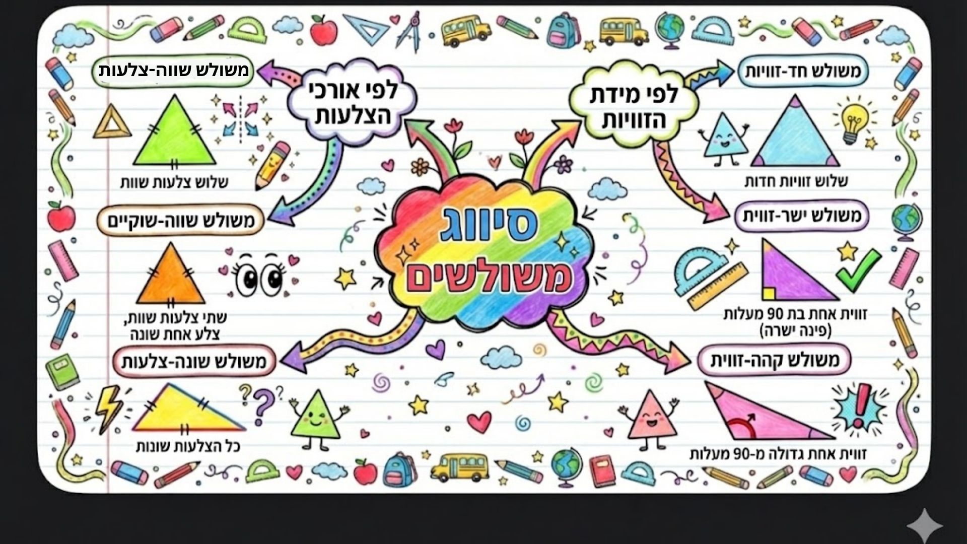 בחרתי לעשות מצגת בנושא סוגי משולשים עבור כיתה ג', מכיוון שהנושא הזה מאוד מתאים להצגה ויזואלית וקל להבנה כשרואים את הצורות בעיניים. משולשים הם נושא מרכזי בגאומטריה בסיסית, והצגה ויזואלית עוזרת מאוד לתלמידים בגיל הזה להבין את ההבדלים בין סוגי המשולשים השונים - משולש שווה צלעות, משולש שווה שוקיים, משולש מגוון, משולש ישר זווית, משולש חד זווית ומשולש קהה זווית. כדי להכין את המצגת בצורה מסודרת ומקצועית, השתמשתי בעזרת כלי הבינה המלאכותית "ננו בננה" ליצירת סיכום מקיף של כל הנושא. הסיכום כולל את כל המידע החשוב שהתלמידים צריכים ללמוד, והוא משמש לי כבסיס לבניית המצגת בצורה ברורה ומובנת.