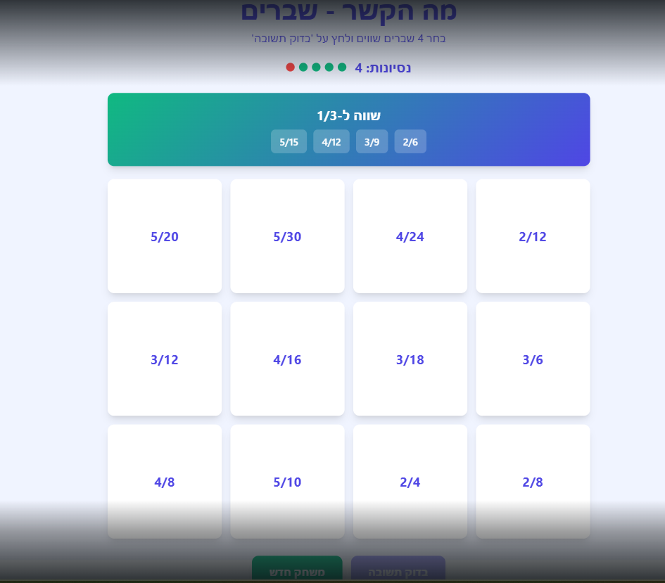 על התלמידים למצוא תוך 5 נסיונות 4 קבוצות של שברים עם הרחבות שונות.