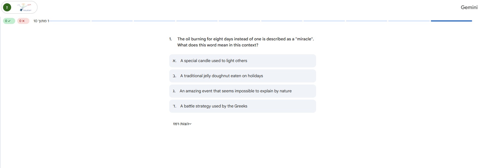 Hanuka Quiz 10.12.2025 אנגלית • היסטוריה ז • ח • ט • י 41 0 0 אנגליתחידון חנוכה באנגלית נוצר בערזת גמיני 3.0 פרו. מתאים לכיתות ז ומעלה. מעבר לקישור