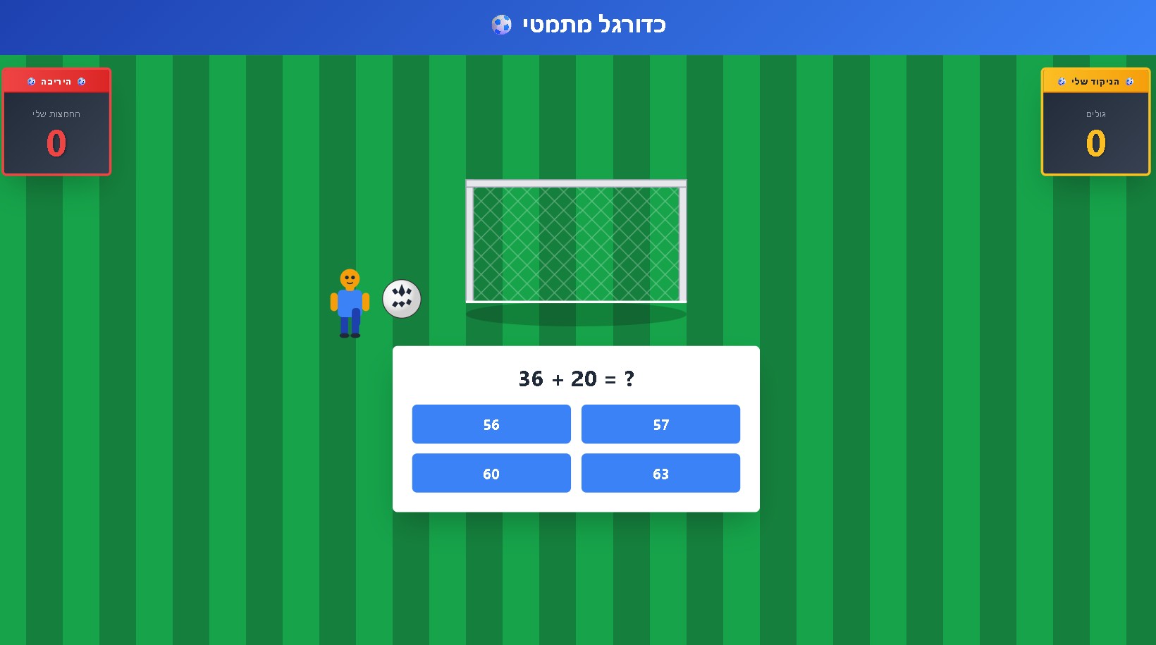 צור לי משחק כדורגל אשר משלב תרגילים בחשבון - חיבור וחיסור בתחום ה100, כולל השלמת נעלם. כלול גם משוואות של גדול\ קטן\ שווה בין שני תרגילים כאלו. כאשר התוצאה נכונה הגול נכנס לשער ומתווספת נקודה, כאשר התשובה לא נכונה, השחק מחמיץ את השער ואין גול.