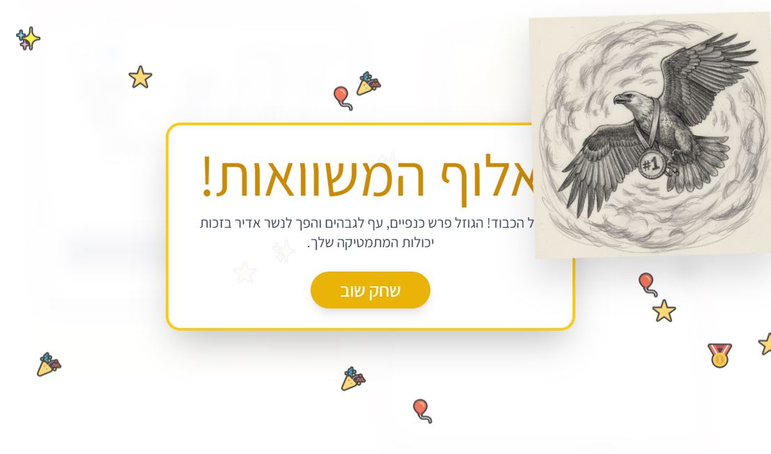 אלוף המשוואות 14.12.2025 מתמטיקה ט • י 20 2 1 אינטראקטיבימשוואותמשחקמתמטיקהעולים שלבבמשחק זה תמצאו ביצה וככל שתפתרו את המשוואות (דרגת קושי עולה) הביצה תתפתח ומה יצא מתוכה? מעבר לקישור