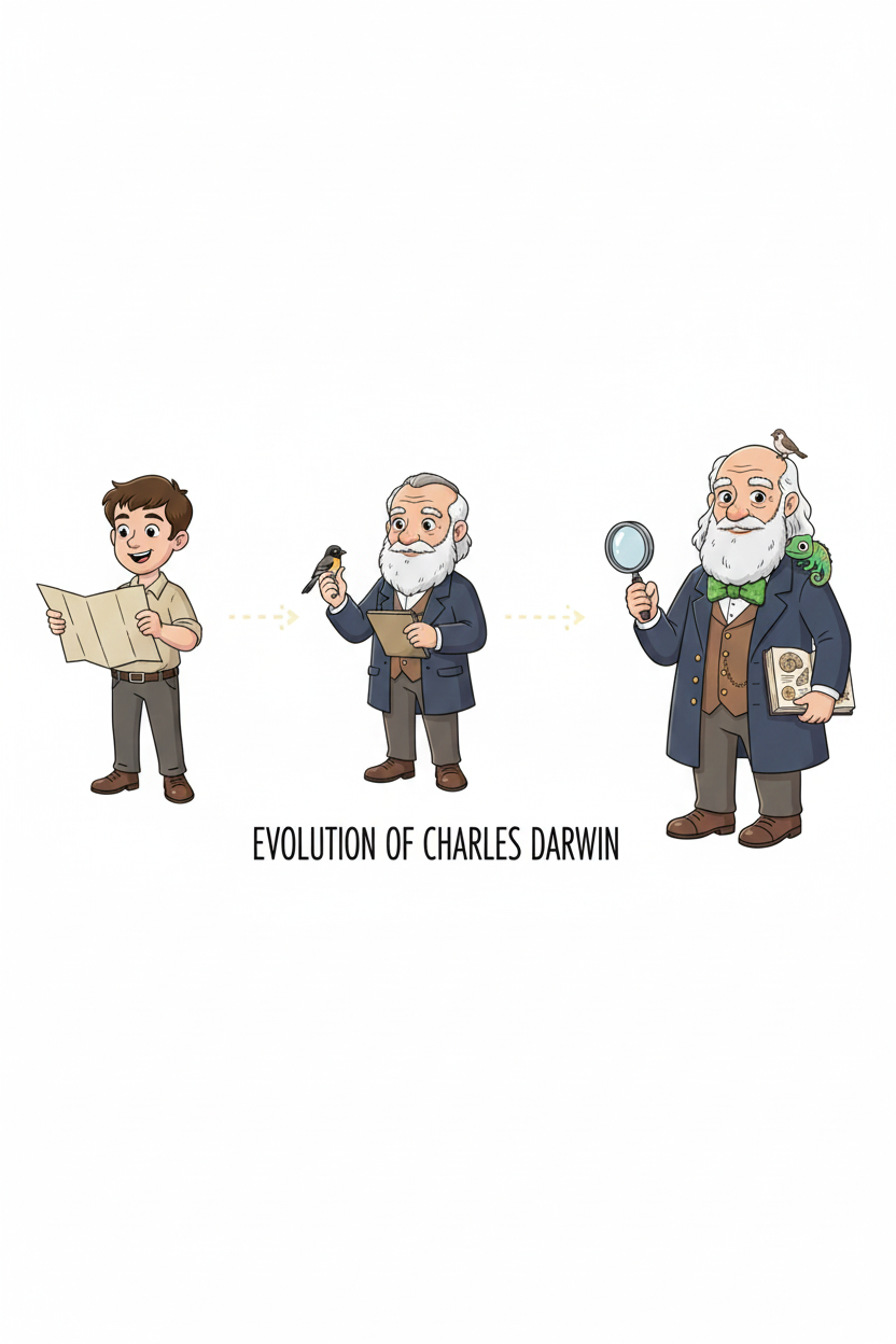 צ'ארלס דרווין: מוצג כדמות המרכזית וכ"אבי תורת האבולוציה". דמותו מאוירת בצורה נעימה ומזמינה המיועדת לילדים, כשהוא עוסק בפעולות חקר כגון תצפית במשקפת, שימוש בזכוכית מגדלת ועיון בספרי טבע ומאובנים.