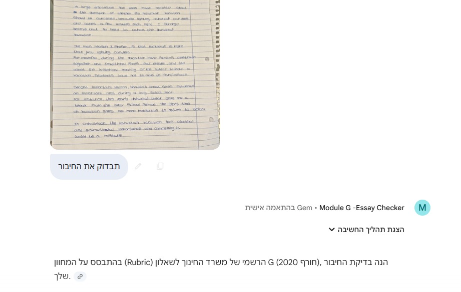 ה'בוט' יודע לתמלל חיבורים (במקרה הזה Module G) , לתת ציון בדיוק לפי המחוון של המשרד,