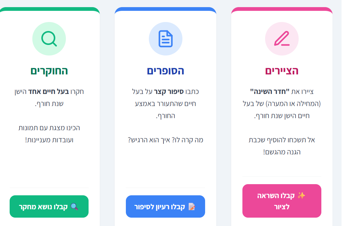 גיוון ודיפרנציאציה: החלק החזק ביותר במערך הוא "כרטיס הבחירה". מתן אפשרות לתלמידים לבחור בין משימה יצירתית (ציירים), משימת כתיבה (כתבים) או משימת מיון (חוקרים) מאפשר לכל ילד לבטא את חוזקותיו ומגביר את המוטיבציה ללמידה