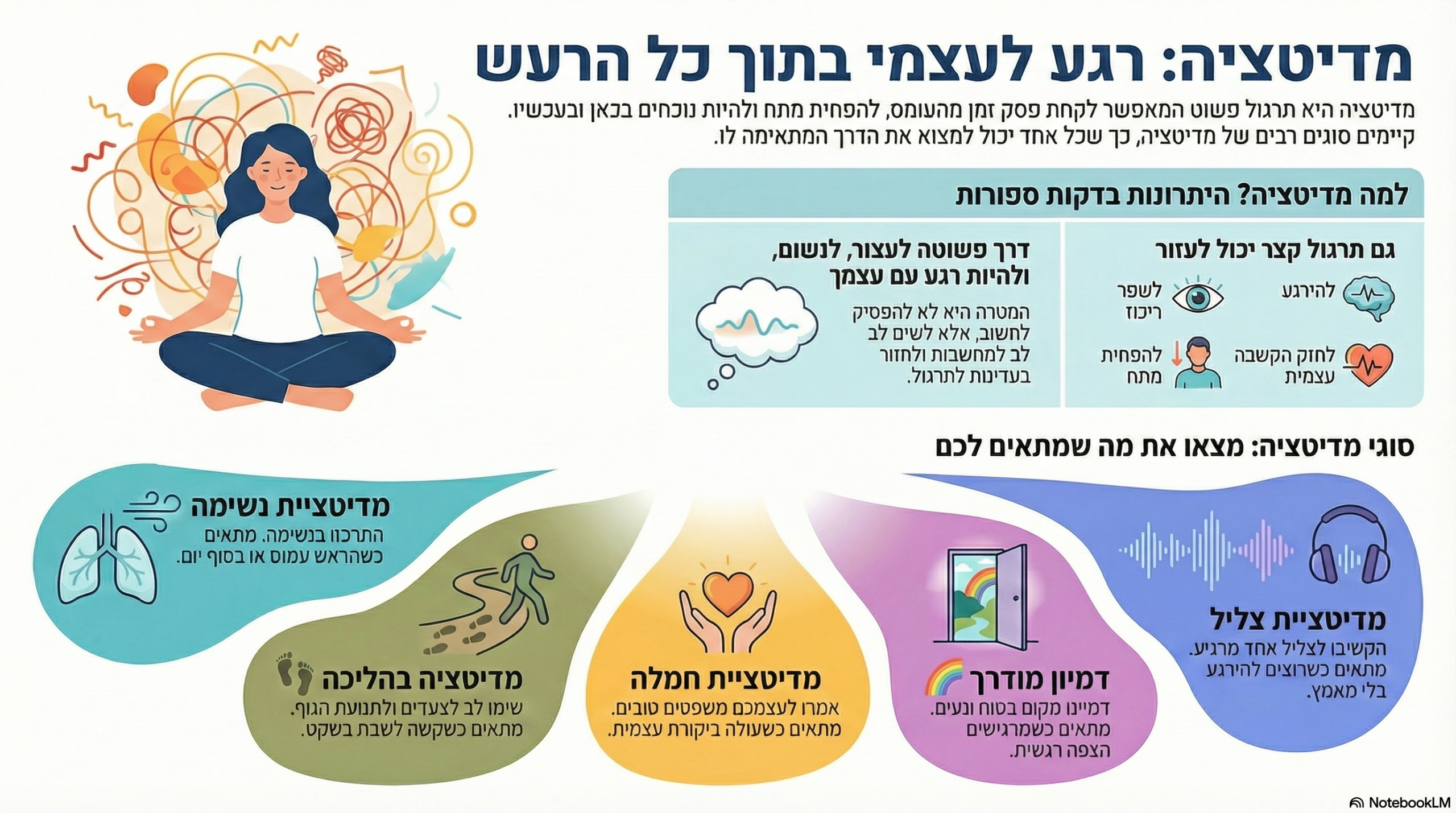 פוסטר אינפוגרפי המיועד לבני ובנות נוער, המציג מגוון תרגולי מדיטציה פשוטים ונגישים לשימוש עצמי. הפוסטר מאפשר היכרות ראשונית עם סוגים שונים של מדיטציה דרך הסברים קצרים, שפה ידידותית ועיצוב בהיר שאינו מעמיס, במטרה לחזק הבנה, סקרנות ותחושת מסוגלות. התוכן מדגיש בחירה אישית והתאמה למצבים יומיומיים של עומס, לחץ רגשי או צורך ברגיעה, ומעודד תרגול עצמאי קצר כחלק משגרה יומיומית. מיועד לתלייה בכיתה, במרחבי בית הספר ואפילו בבית.