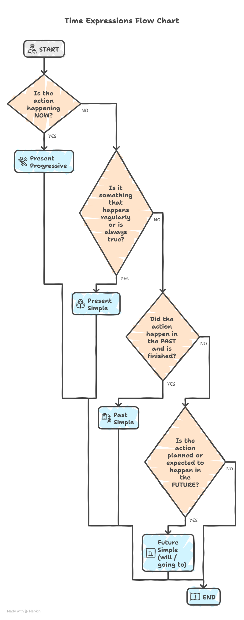 Time Expressions 11.1.2026 אנגלית ז • ח 41 0 0 נפקיןעולים שלבקנבהתרשים זרימהתרשים זרימה בו מוסבר מתי יש להשתמש בכל זמן באנגלית ומה ביטוי הזמן המאפיינים אותו. מעבר לקישור