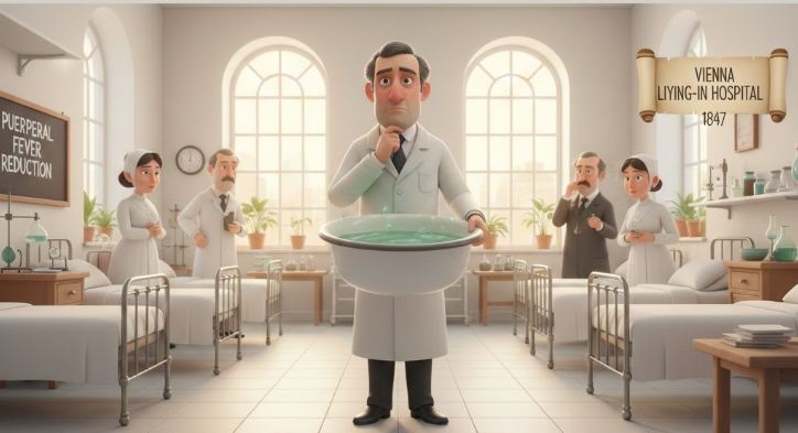 איגנץ זמלווייס: חשיבות רחיצת הידיים (תצפית, השוואת נתונים, בדיקת השערה).