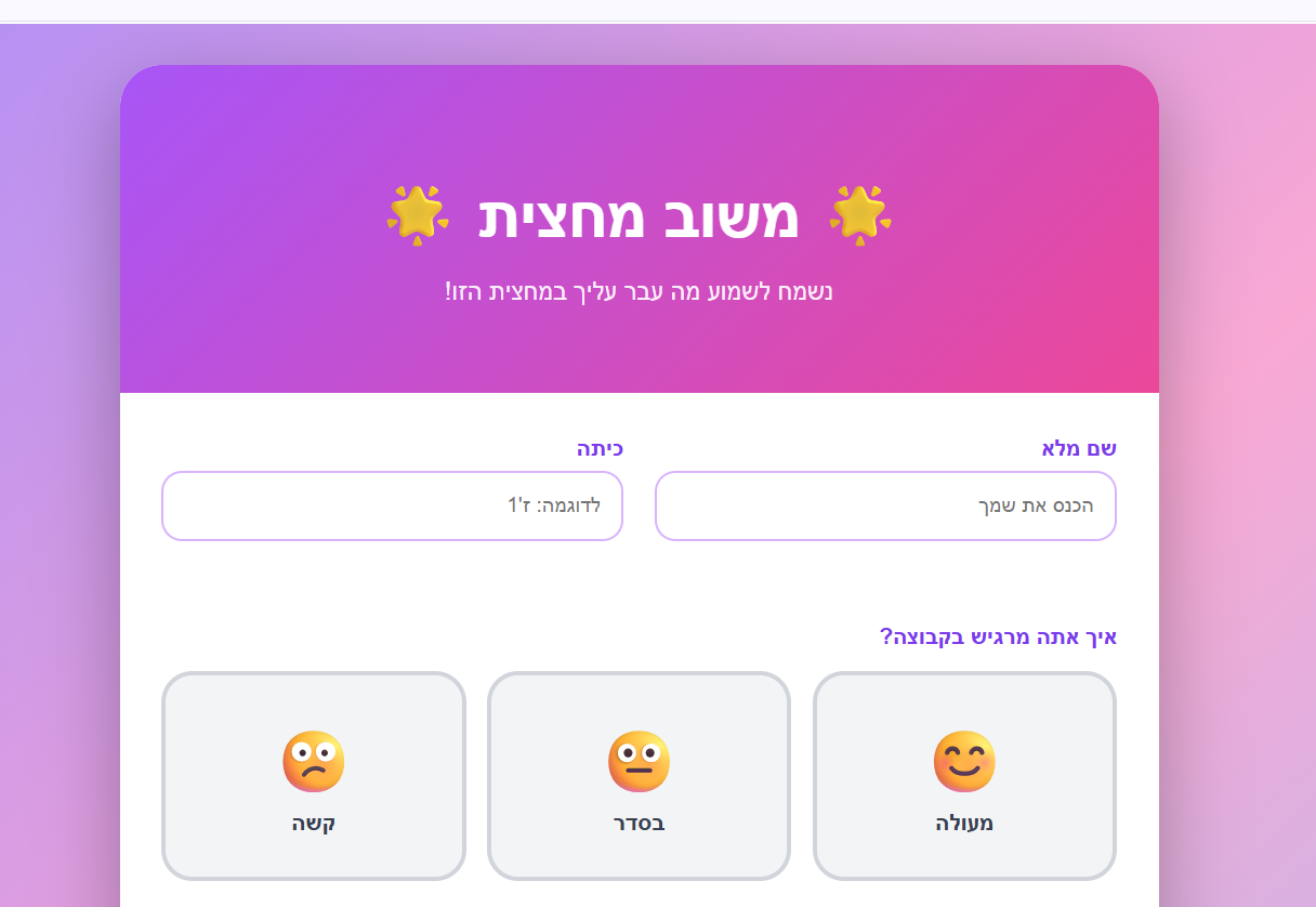 פרומפט: צור לי Web App רספונסיבית ב-Apps Script (מקושר לגליון שמהווה בסיס נתונים) עם Google Sheets. 2 קבצים: Code.gs + Index.html. כשפותחים את ה-URL, האפליקציה נפתחת ישירות. ללא העתקת IDs או קישורים. אני רוצה שהאפליקציה תהיה משוב ללימוד במחצית הזו. הכותרת תהיה "משוב מחצית", בפנים יהיו שאלות: איך אתה מרגיש בהקבצה? עם אפשרויות לבחירה בתוספת סמיילי תואם. כמובן מקום לכתוב שם וכיתה. איזה נושאים קלטתי היטב, באיזה נושאים אני צריך חיזוק? דברים שהיית רוצה להשתפר בהם, בקשות מהמורה. תעצב מהמם, צבעוני ומשמח, בפונטים יפים ומזמינים.