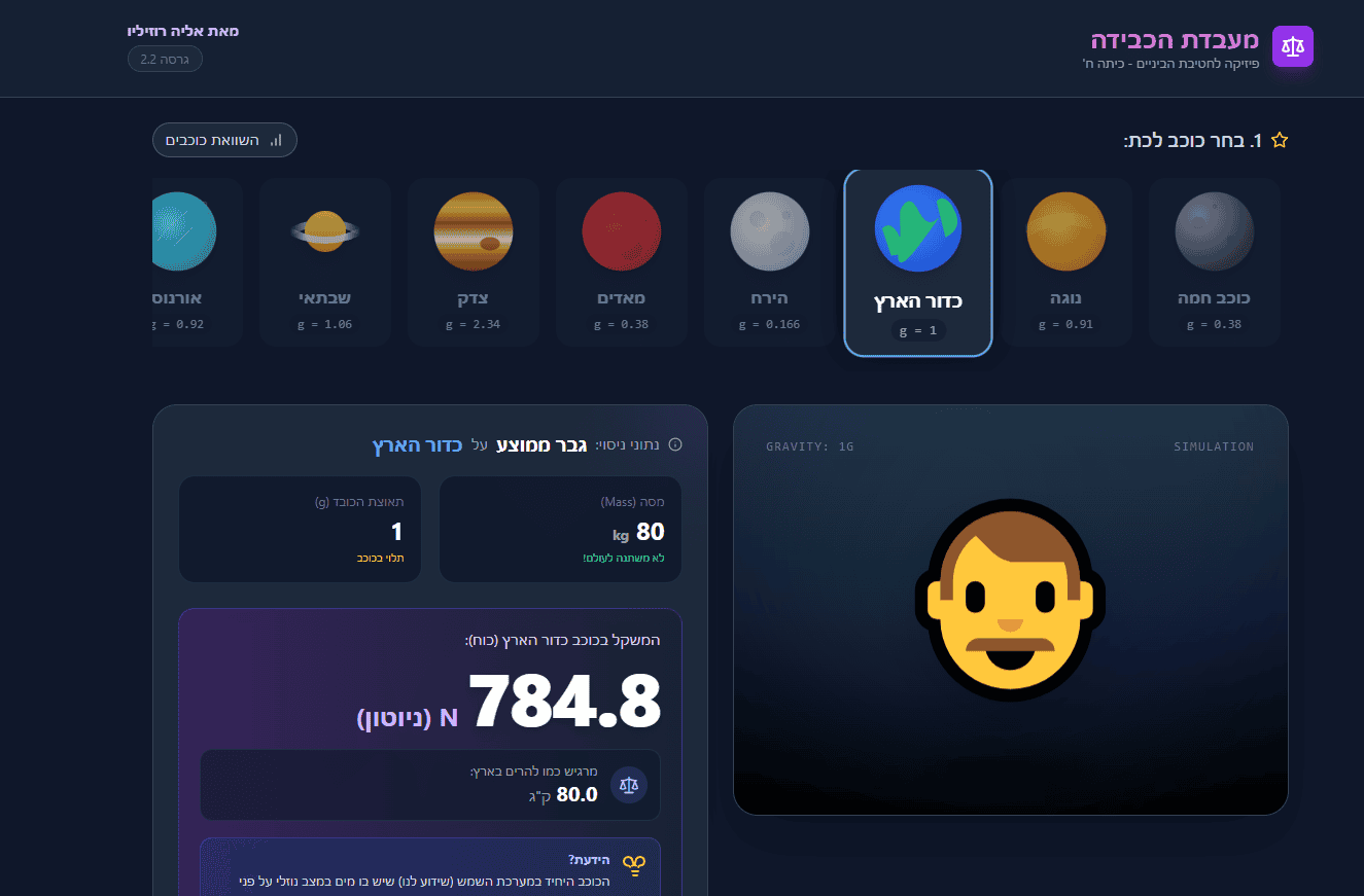 מוזמנים להנות מאתר שבניתי, בנושא כוח הכבידה - משקל ומסה, בעצם באתר הוא מראה השוואה מגניבה בין משקל האדם ועוד הרבה חפצים בכדור הארץ וכמה הם ישקלו בכוכבי לכת אחרים