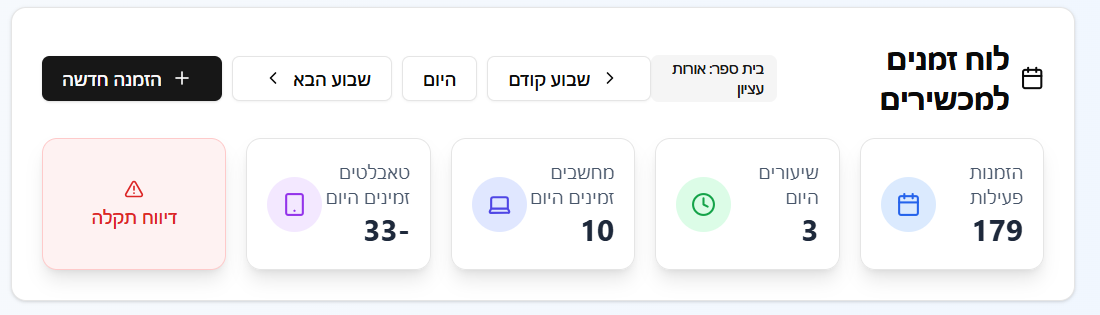 מערכת חכמה וידידותית לניהול השאלת מחשבים ניידים וטאבלטים בבתי ספר. המערכת מאפשרת למורים להזמין ציוד טכנולוגי לשיעורים, למנהלים לעקוב אחר המלאי והשימוש, ולנהל את כל תהליך ההשאלה בצורה יעילה ומסודרת.