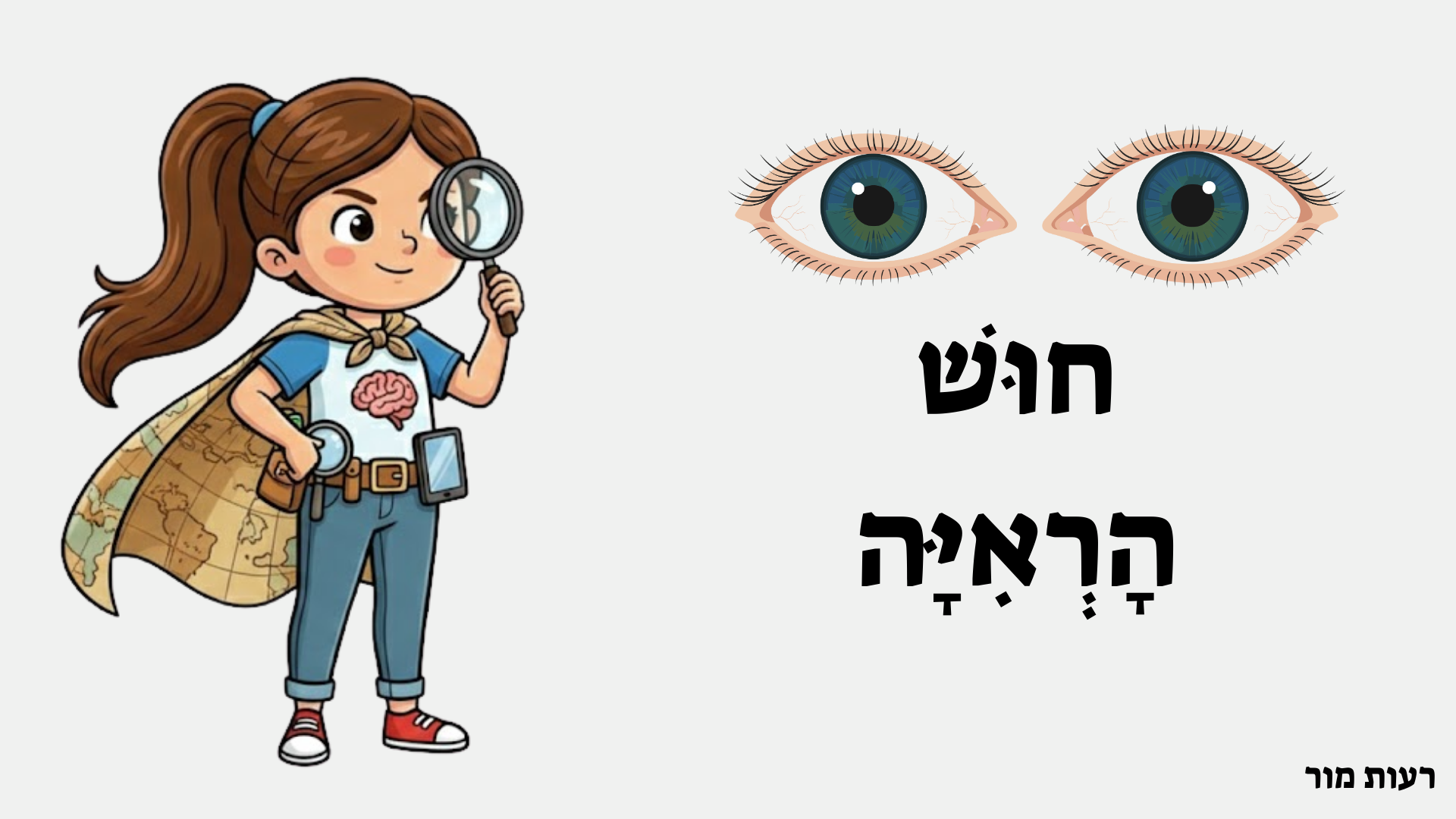 מצגת במדעים, על חוש הראייה לכיתה א' (חינוך מיוחד) את המצגת מלווה דמות עקבית שמעוררת את המוטיבציה של הילדים ומלווה את הלמידה. במצגת תחילה מפורט מערך השיעור, שיר חושים, פירוט למה צריך את חוש הראייה, הצעה להתנסות, חקר מחוץ לכיתה ודף עבודה.