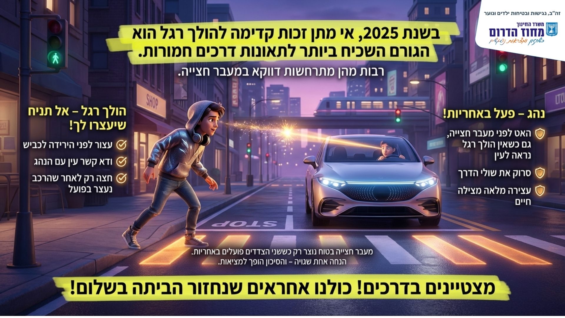 בשנת 2025 אי מתן זכות קדימה להולך רגל היא העבירה השכיחה ביותר כגורם לתאונות דרכים חמורות. חובה להעלות את המודעות לאחריות ובטיחות בקרב אנשי החינוך, התלמידים, ההורים והקהילה.