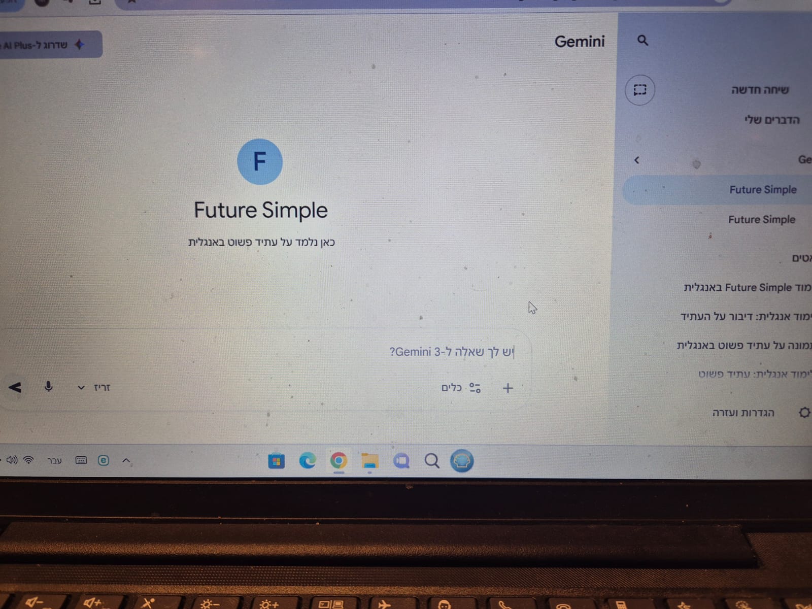 מטרת הפריט היא לימוד הזמן future simple בעזרת בוט שמלמד ומתרגל עם התלמידות, מתאים לשיעור אנגלית עם בנות בכיתה ט' אחרי לימוד הנושא בכיתה. השיטה של הבוט יכולה במקום לתקן אותן אם הן עושות טעות ולהסביר להן במה טעו או כמובן לעודד אם הן הצליחו