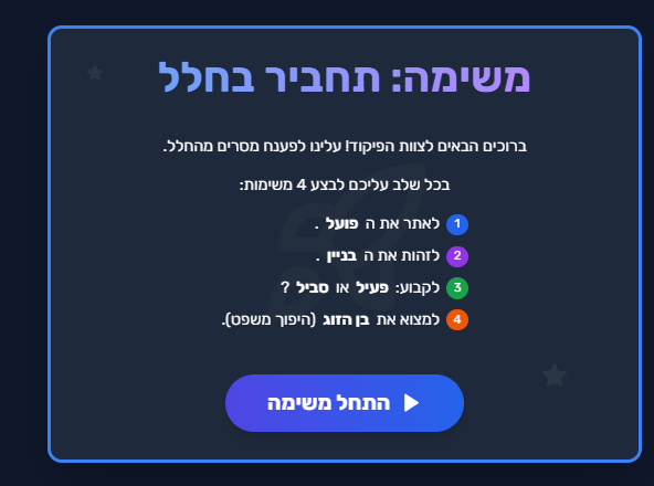 @אלישבע ברכיהו 🌱 תורם פעילה לפני 5 ימים, 8 שעות 5 📝 פוסטים 336 👁️ צפיות 5 💬 תגובות 5 ❤ לבבות 2 💬 הגיב 0 🏷️ תייג הפוסטים שלי האוספים שלי פרופיל חברים פעילות קבוצות כל הפוסטים שהעלית: 29 בינו 2026 לשון בניינים פעילים וסבילים- תרגול 29 בינו 2026 לשון בנייני הפועל- משחק ★★★★★ ★★★★★ 29 בינו 2026 שפה בנייני הפועל- תרגול 28 באוג 2025 תנ"ך התמצאות בשמות ספרי התנ"ך וסדרם ★★★★★ ★★★★★ 25 באוג 2025 שפה זהה את המילה